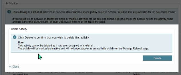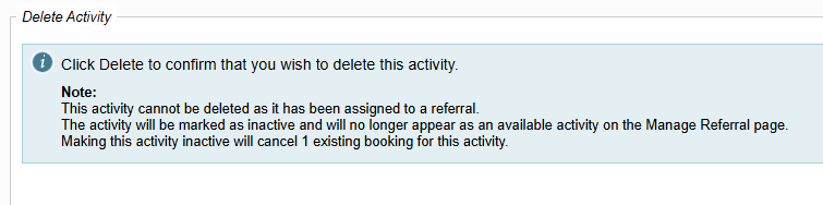 When Delete is selected, the following different prompts will appear, depending on whether the activity has been assigned to a referral.