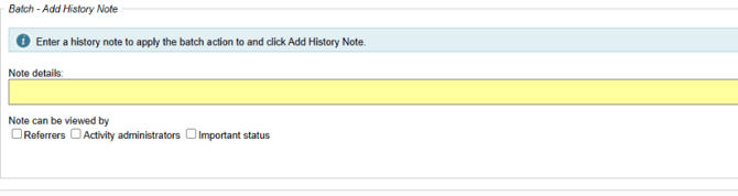 The new bulk add history note feature allows users to add a history note to several referrals at once. It's particularly useful when you need to record communication with referrals outside of the system; adding a batch note ensures their history is updated accordingly whilst being a huge time-saver.