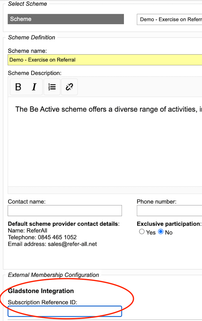 The field in the Schemes Screen, which is the Gladstone reference for the appropriate subscription type, appears here: