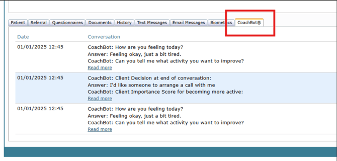 In the referral record, navigate to the CoachBot® tab a list shows the relevant conversations with an option to "Read more".